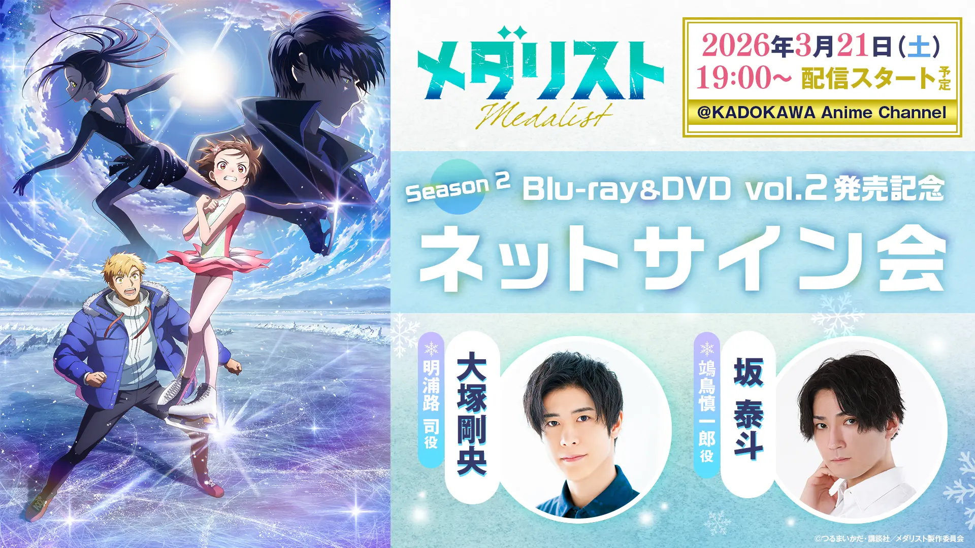 TVアニメ「メダリスト」Season2 Blu-ray&DVD vol.2の発売を記念して、カドストにて先着でご予約いただいた方を対象に特典として、「明浦路 司」役の大塚剛央さんと「鴗鳥慎一郎」役の坂 泰斗さんによる直筆サインとお宛名を入れた「メダリスト」特製ミニ色紙を差し上げます! 注意事項をご確認の上、たくさんのご参加をお待ちしております!!
