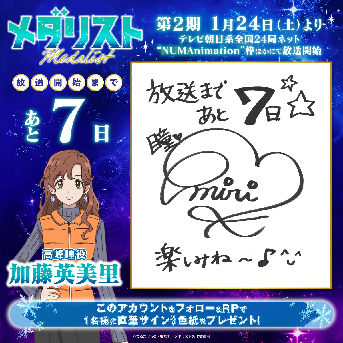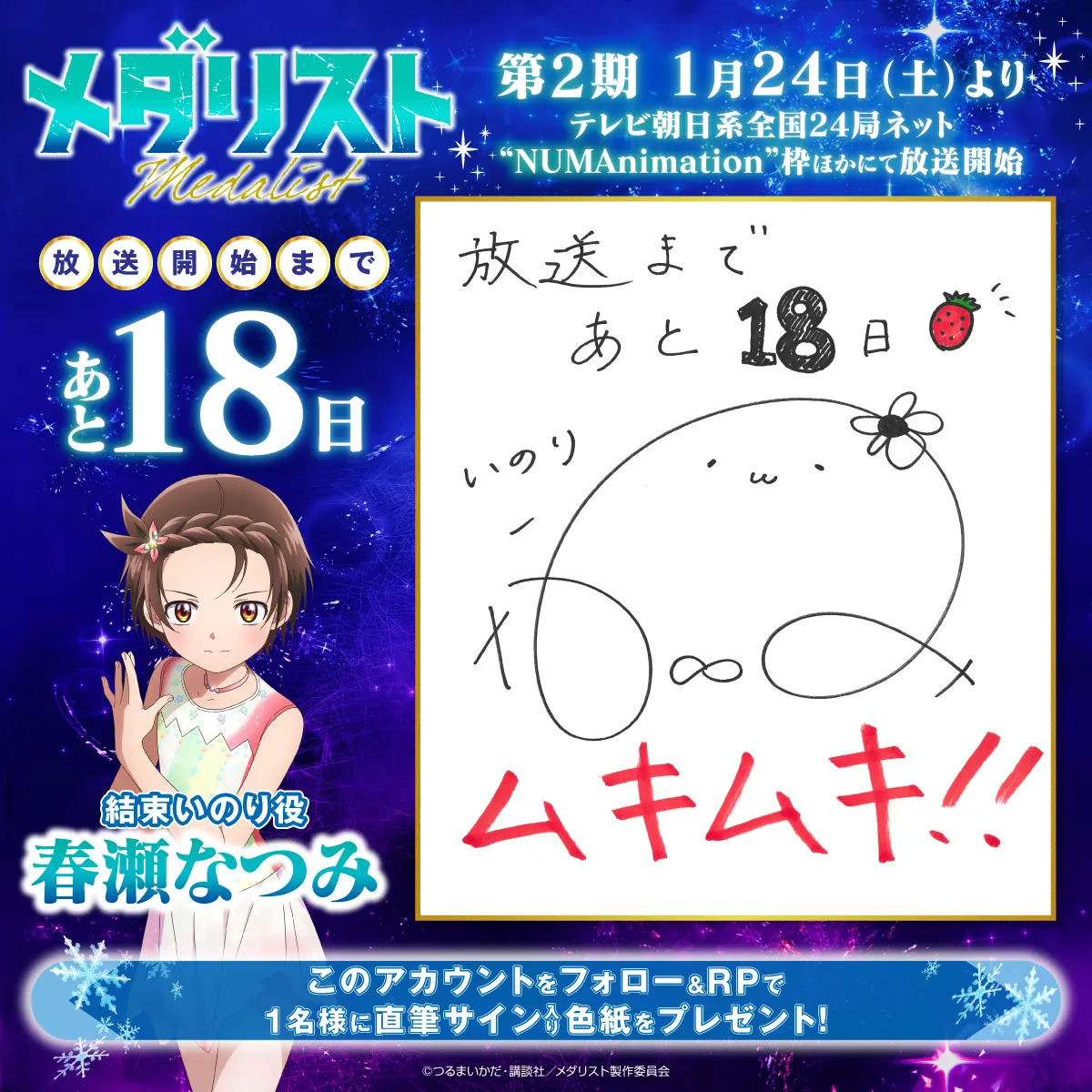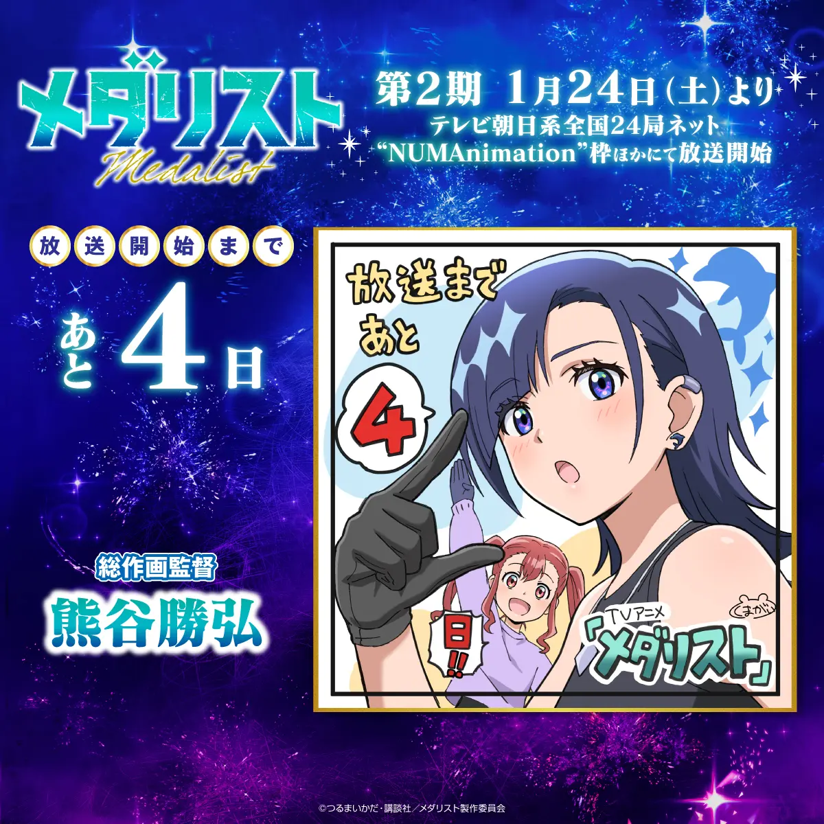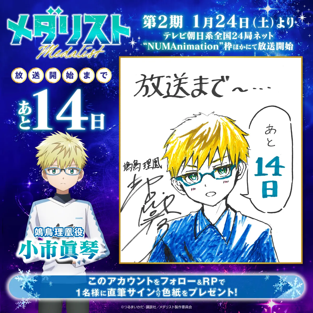 カウントダウンプレゼントキャンペーンを実施します! 『メダリスト』アニメ公式アカウント(@medalist_PR)をフォローし、指定のキャンペーン投稿をリポストした方の中から、抽選でプレゼント!ぜひ奮ってご応募ください!