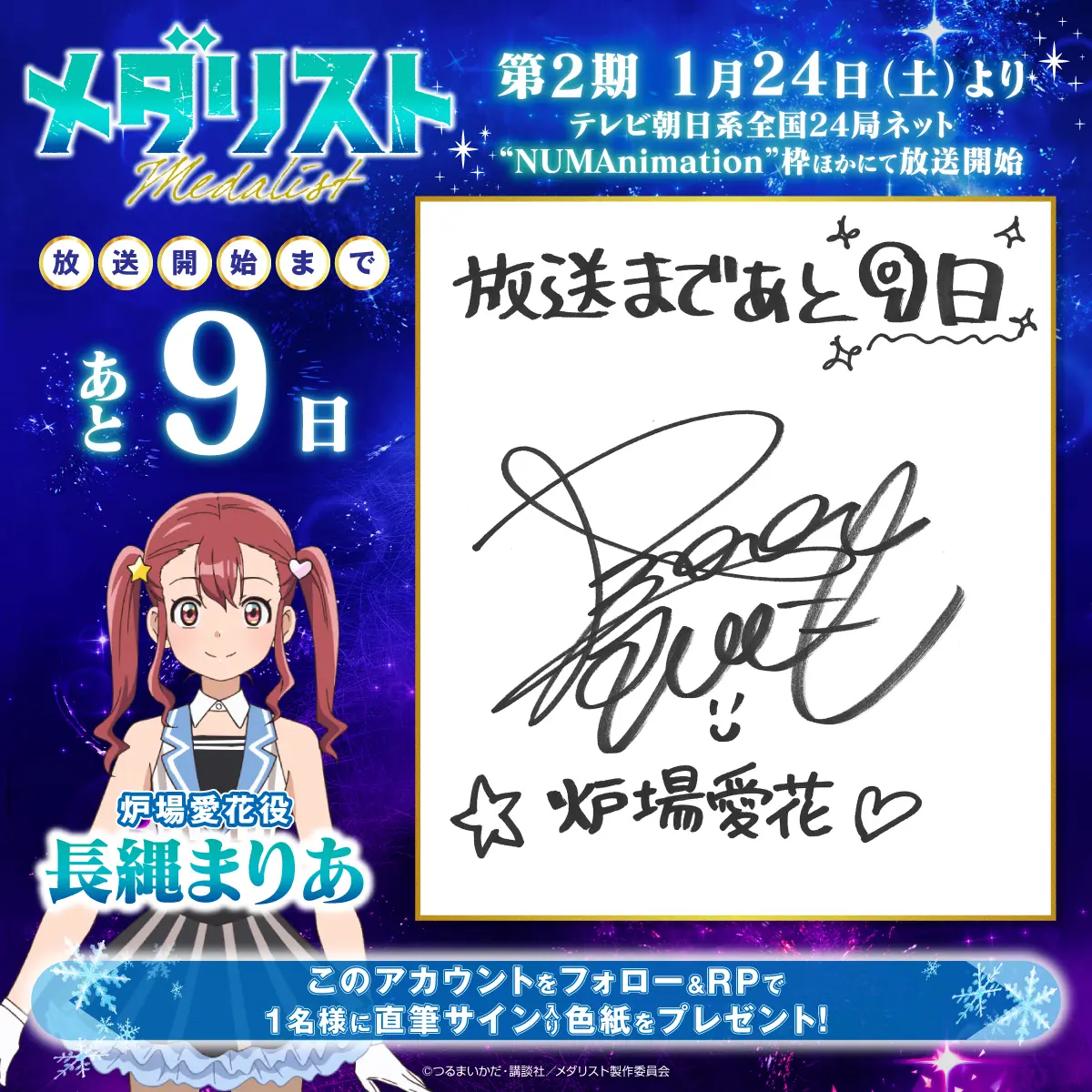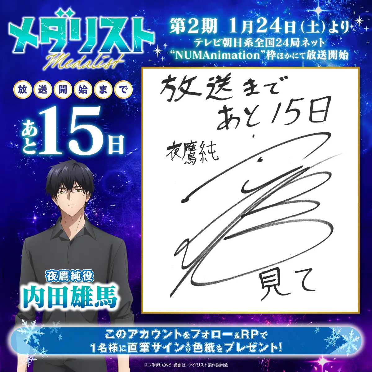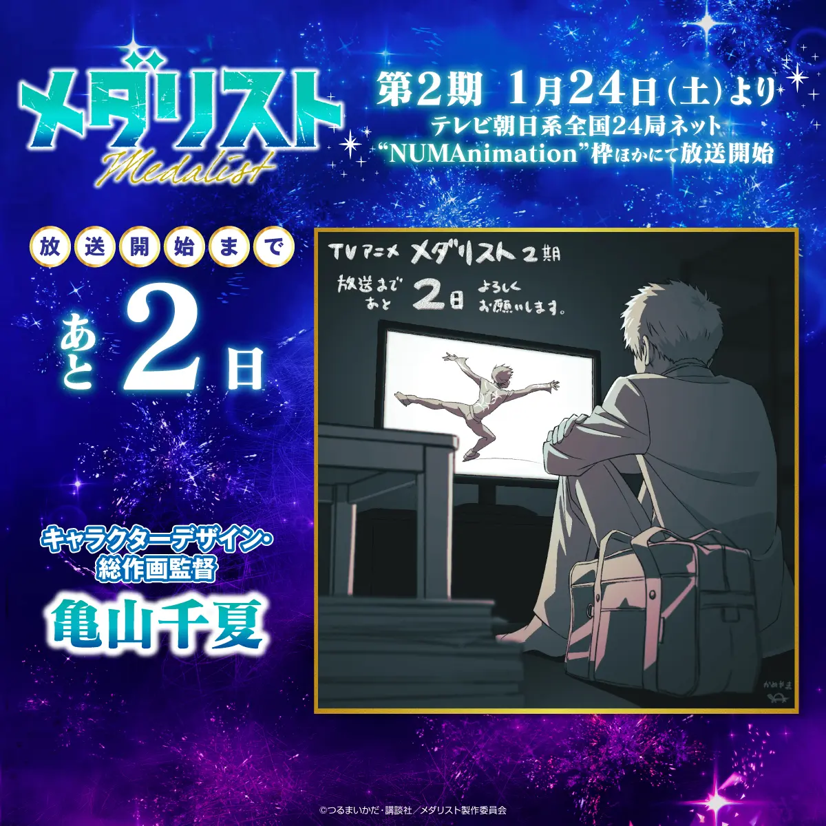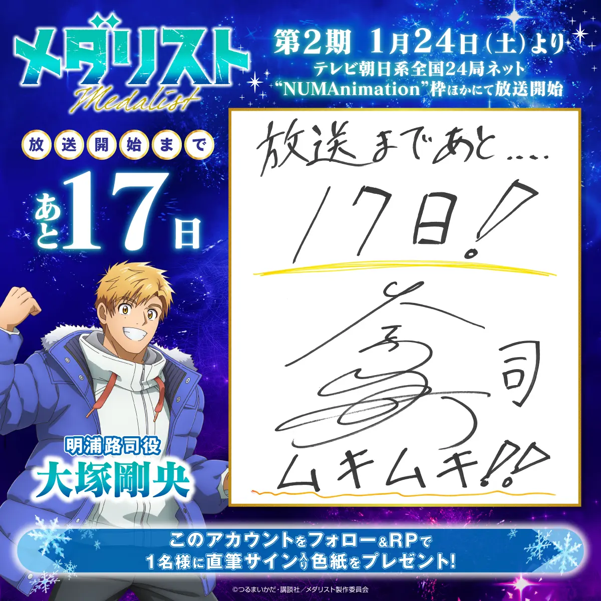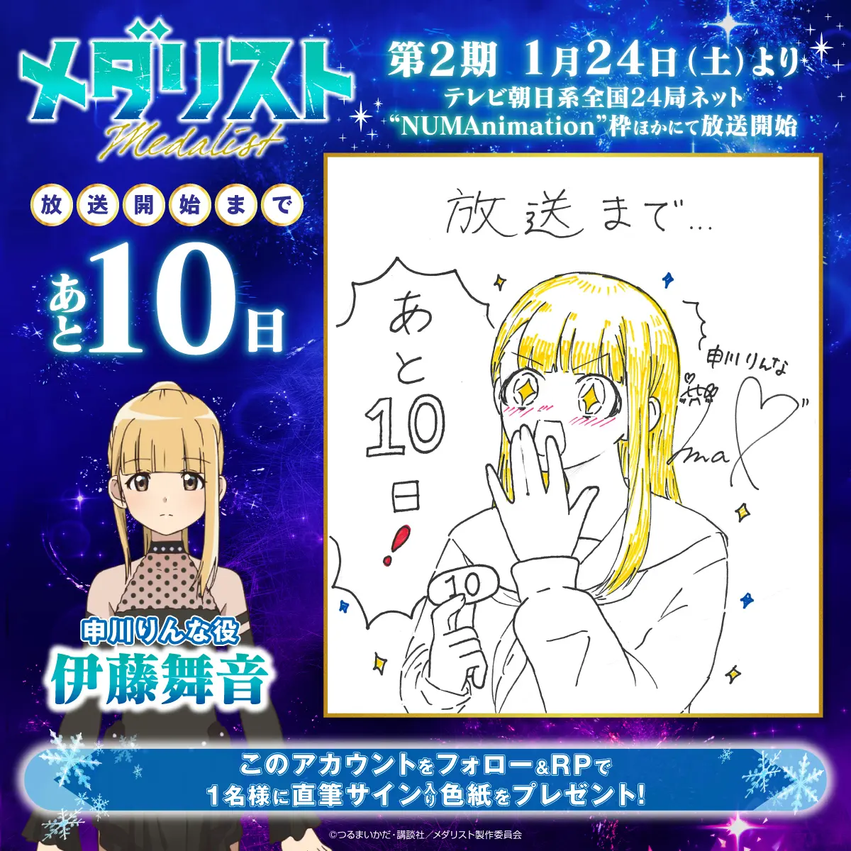 カウントダウンプレゼントキャンペーンを実施します! 『メダリスト』アニメ公式アカウント(@medalist_PR)をフォローし、指定のキャンペーン投稿をリポストした方の中から、抽選でプレゼント!ぜひ奮ってご応募ください!