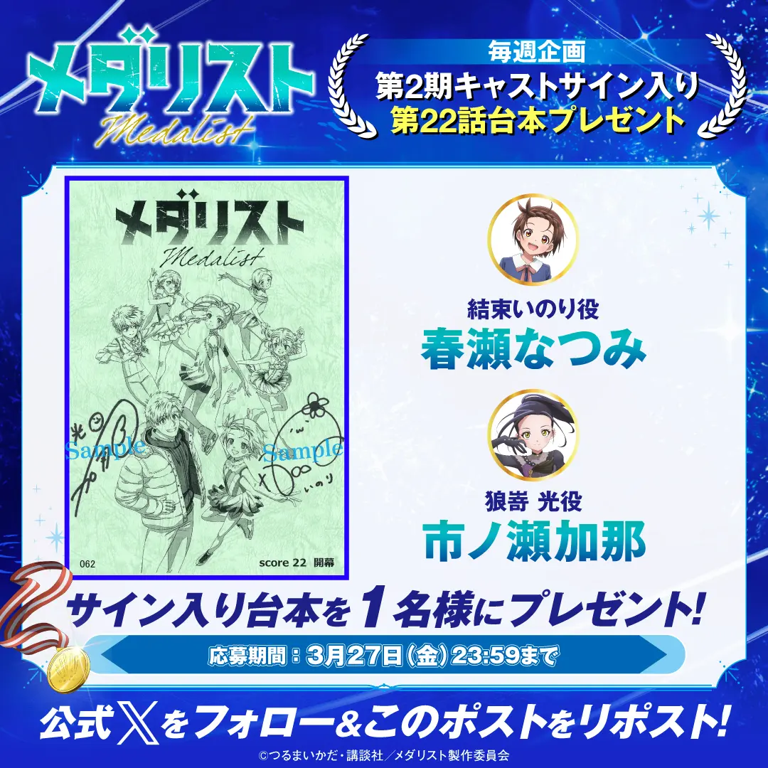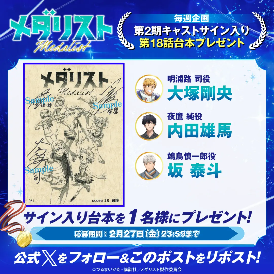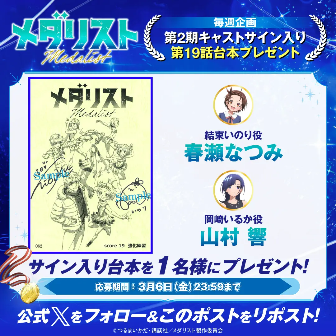毎週放送にあわせてプレゼントキャンペーンを実施します! 『メダリスト』アニメ公式アカウント(@medalist_PR)をフォローし、指定のキャンペーン投稿をリポストした方の中から、抽選でプレゼント!ぜひ奮ってご応募ください!