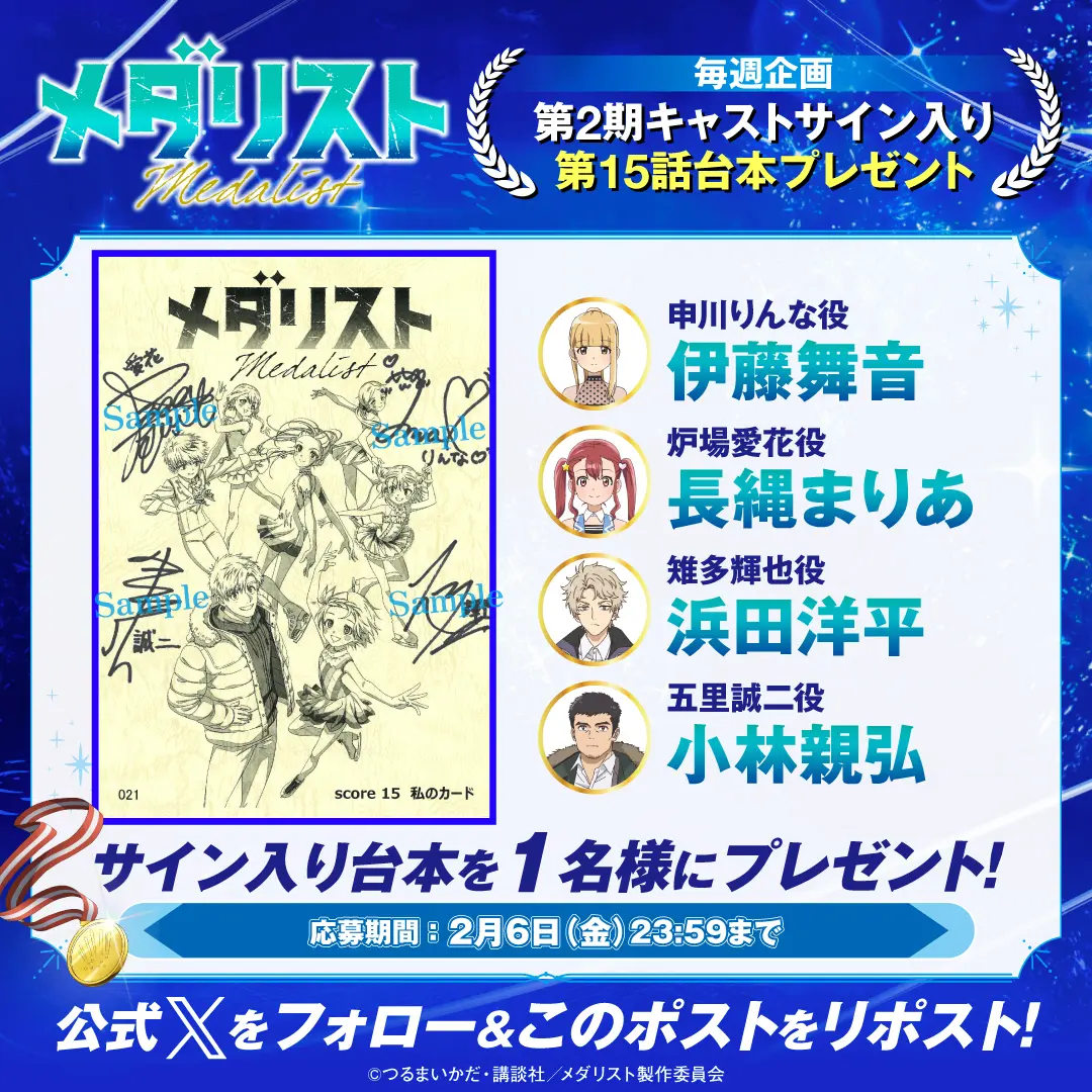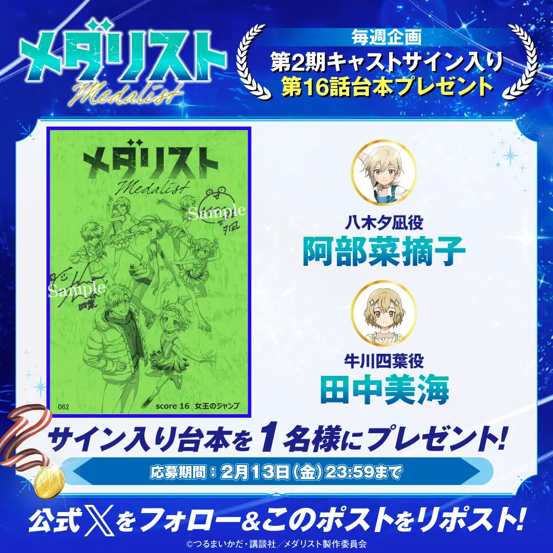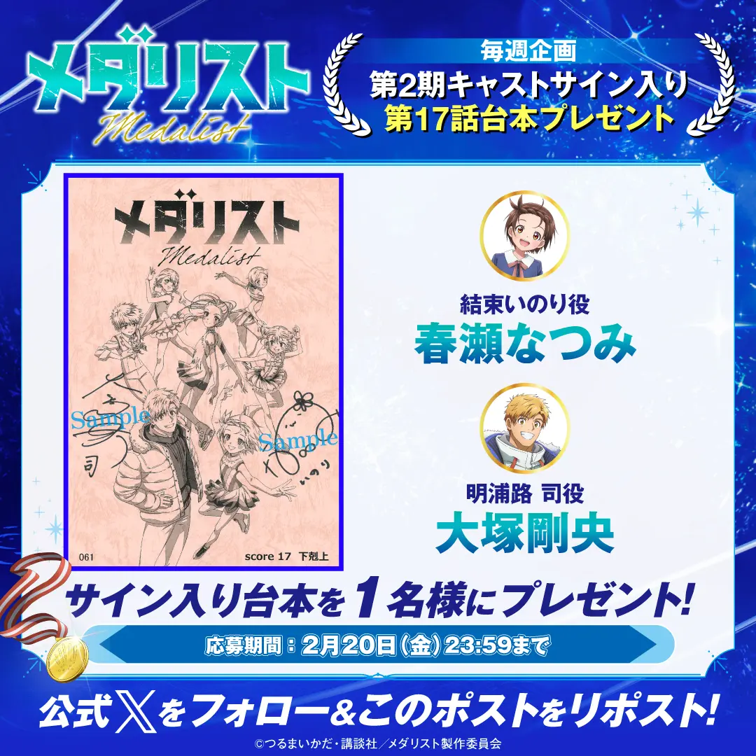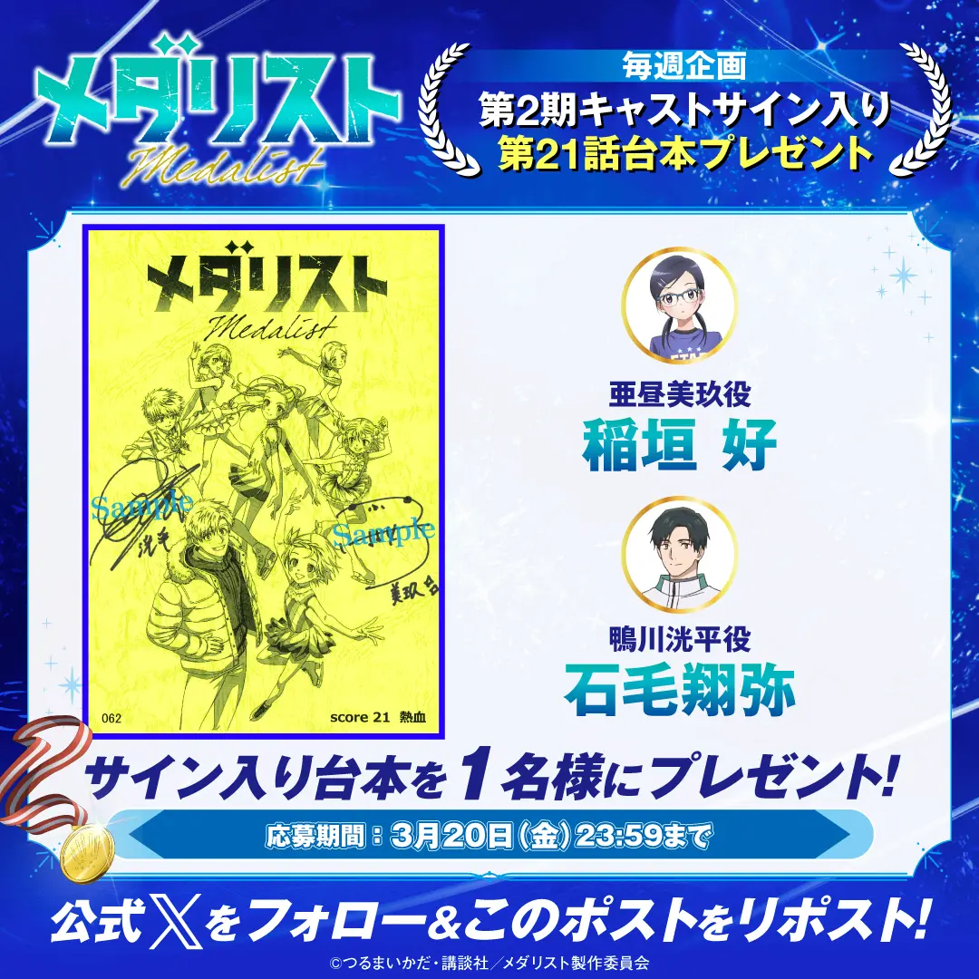 毎週放送にあわせてプレゼントキャンペーンを実施します! 『メダリスト』アニメ公式アカウント(@medalist_PR)をフォローし、指定のキャンペーン投稿をリポストした方の中から、抽選でプレゼント!ぜひ奮ってご応募ください!