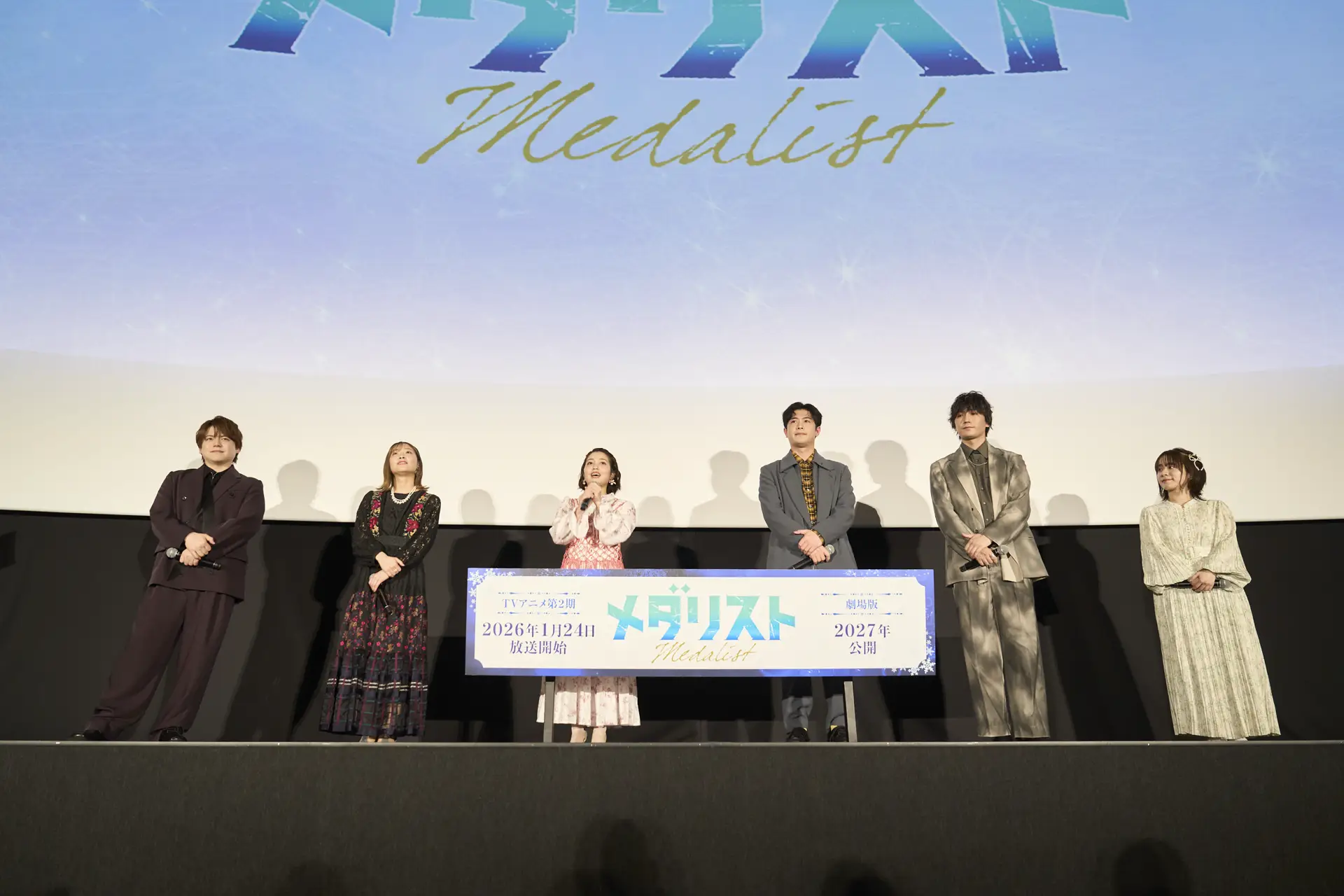最後の挨拶で阿部は「今日は第2話まで観ていただきましたが、この先も楽しみにご覧いただければと思います」と呼びかける。 坂は「第1期では慎一郎の優しいお父さんの一面が描かれていましたが、第2期では銀メダリストのコーチとして司たちとぶつかり合う姿が観られます。第2期も楽しみにしていてください!」と注目ポイントを挙げてアピール。 内田は「第2期に入って、たくさんの選手たちのドラマが描かれていきます。第2期でもなかなかミステリアスな部分はあると思いますが、夜鷹の気持ちは光の中に残っていると思います。引き続き、光に注目して観てください!」とコーチらしいコメントで締めくくる。 市ノ瀬は「第2期の第1話では、この先の光ちゃんの片鱗が見えた瞬間もありました。この先はいのりちゃんの滑りや他の選手の演技を、最後まで温かい目で見守ってください。最後の最後まで余すことなく、1秒1秒面白いので!」とおすすめ。 大塚は「第1期の放送が終わって、たくさんのみなさまに届いて、いち『メダリスト』ファンとしても、“見なよ…俺の『メダリスト』を…”状態でしたが」と原作ファンとしての思いに触れ、「(その熱い想いが)みなさんに伝わって、さらにその先(劇場版)も決まっているということで、まだまだ『メダリスト』を一緒に楽しんでいただけるのがうれしくて仕方ないです」と満面の笑みで「まずは第2期、そしてその先と原作とあわせてアニメを応援してください!」とリクエスト。 「アツアツの時間とみなさんと過ごすことができて、幸せでした!」と元気に挨拶した春瀬は「第2期の放送、劇場版も決まっているので、勢い、アツさは止まることをしらない。これから、いのりと司の絆も深まっていきます。ライバルそしていのりの演技、すごい演技が観られるので注目して待っていてください!これからもよろしくお願いします!」と呼びかけ、熱気あふれるイベントを締めくくった。